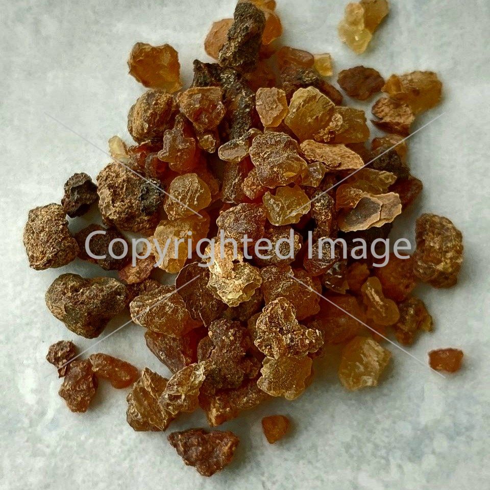 HALAL. middle fraction Opopanax (Bysabolmyrhe) - sweet myrrh, or Women's Myrrh. It is isolated from the glandular passages of the bark of the tree Commiphora erytharaea Engl; when cut, milky juice naturally flows out. Used as incense and for anointing. When rubbed with water, it gives a white emulsion. The smell is strong pleasant, the taste is bitter. Since ancient times, it has been used as a remedy for tonsillitis, scurvy, in dental practice and for inhalation for colds. It is used as an oriental ingredient for flavoring foods such as candies and biscuits. It is widely used in oriental medicine and perfumery, as incense and fragrant women's mixtures. In cosmetology, women's myrrh is used to prepare products that restore the skin of fading, dry, thinned skin. As a preventive measure, it improves skin firmness and elasticity, promotes cell regeneration. Various procedures with this type of resin significantly rejuvenate the skin, cleansing it of dead cells. Apparently smoothes mimic wrinkles. It is an effective means of preventing cellulite, the skin after its application becomes smooth and elastic, then the pores expand, and the skin perfectly perceives any cosmetics. It is valued for its ability to even out the surface and tone of the skin, and is also indispensable for activating blood and lymph microcirculation. Application: ! Before applying to the face, rinse a portion in a flowing hearth to wash off possible dust from the natural tree bark. ! We do not throw away the used portion - we dry it and apply it a second and third time, each time adding ? volume of fresh resin. ! The same used resin can be used during the hair and skin fumigation ritual (as bakhoor). It has a bright healing effect on a person: strengthening immunity, antiviral, anti-influenza effect, leaves a pleasant aroma in hair and clothes. Purifies the human aura and is an excellent protection against the stress of the city. How to use: 1. The solution, after brewing with boiling water or boiling, is used as a tonic, spraying - as thermal water, in the form of frozen cubes, as an additive for dilution in any kind of masks, add to natural shampoo when foaming on the hair. Use 1 tsp. dry resin in a glass of water for preventive purposes, for therapeutic purposes - increase the dose of resin to 2 tsp. Boil the resin for 10 to 20 minutes. 2. Hot inhalations: the hot solution is covered with a towel and the skin of the face is warmed up for 5-10 minutes - this is an effective cleansing of pores, increased blood supply, smoothing the skin, intensive treatment of rashes. 3. Medical applications - crush the resin to powder, mix for consistency with any other composition for masks, apply on the skin in a dense layer, or under a gauze mask, or allow to dry. Remove from the skin with a swab moistened with any hydrolat. 4. As a body and face scrub - also grind into powder or grind in a coffee grinder. Then use either in its pure form, massaging the body, or mixed with a small amount of natural shower gel or face product. 5. In folk medicine of the Middle East, it is used as an anti-cold natural remedy (gargling with warm / normal temperature infusion of boiled resin, strained or inhaled over a solution). 6. Head massage: after sprinkling the hair roots with a decoction of resin, apply by rubbing into painful areas - the effect of relaxation is achieved, relieving tension from the muscles, soothes, reduces stress, improves mental clarity and increases activity and robotic ability. 7. Is an arodisiac. Strengthens immunity. 8. For hair, styling spray: Apply strained decoction of resin to the roots and along the entire length of the hair. Seals the hair shaft, at the same time gives density and volume to the hairstyle. It intensively nourishes the bulbs and improves blood circulation and oxygen exchange. 9. For nails and hands: heat a crumb of resin in hot water and rub into the nail plates. Strongly strengthens the nails, they become polished, even, and the effect of whitening the nail plate is also achieved. 10. Resin can be added to any handmade cosmetics, as a finely ground powder, to increase the lifting and antiseptic properties of the product. It is a natural preservative compositions. 11. Tonic for hair growth: mix a concentrated healing decoction of resin additionally with resin powder (on the tip of a knife), add half the volume of red pepper tincture to alcohol (pharmacy). Dilute this mixture with warm water or chamomile or cornflower hydrolate 1/5 (5 parts of hydrolate, 1 part of the mixture), apply strictly to the hair roots, avoiding contact with eyes and mucous membranes. Wash hands thoroughly after application! Put on a warming cap and keep the tonic for 0.5-1.5 hours (no more). Wash off with natural shampoo. This procedure is done once a week. It greatly activates blood circulation in the scalp, which helps to increase the nutrition of the hair follicles. Also destroys dandruff. 12. Oil extraction: dissolve some resin in hot oil and use this substance as an oil mask for face and body. 13. Incense. Use this resin for incense in an electric or traditional turquoise burner. Myrrh resin has exceptional properties, calms and cleanses the etheric, astral and mental bodies of a person from everything alien. Oil concentrate Resins are best added in approximately equal proportions, at least by eye. Also, before preparing the oil concentrate, it is better to crush the resin by hand. Do not use electrical appliances, the resin melts, and besides, this method deprives you of the pleasure of preparing a real oriental beauty elixir and many of its magical aspects. Use your own energy to charge the resin with the goals you would like to achieve! We also recommend using olive oil or sesame oil for boiling. And after complete cooling, add this concentrate to any other oils that you want to see in your care. For example, for the face it can be one selection of the composition of oils or any cream, for the body another, for the hair 